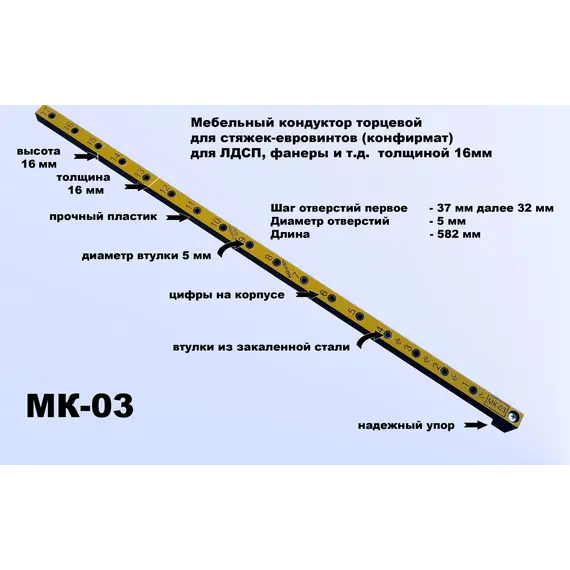 - Мебельный кондуктор кондуктор МК-03 предназначен для сверления отверстий 5 мм в торце плиты 16 мм с шагом отверстий 32 мм. (можно сверлить плиты и другой толщины с использованием переходников)