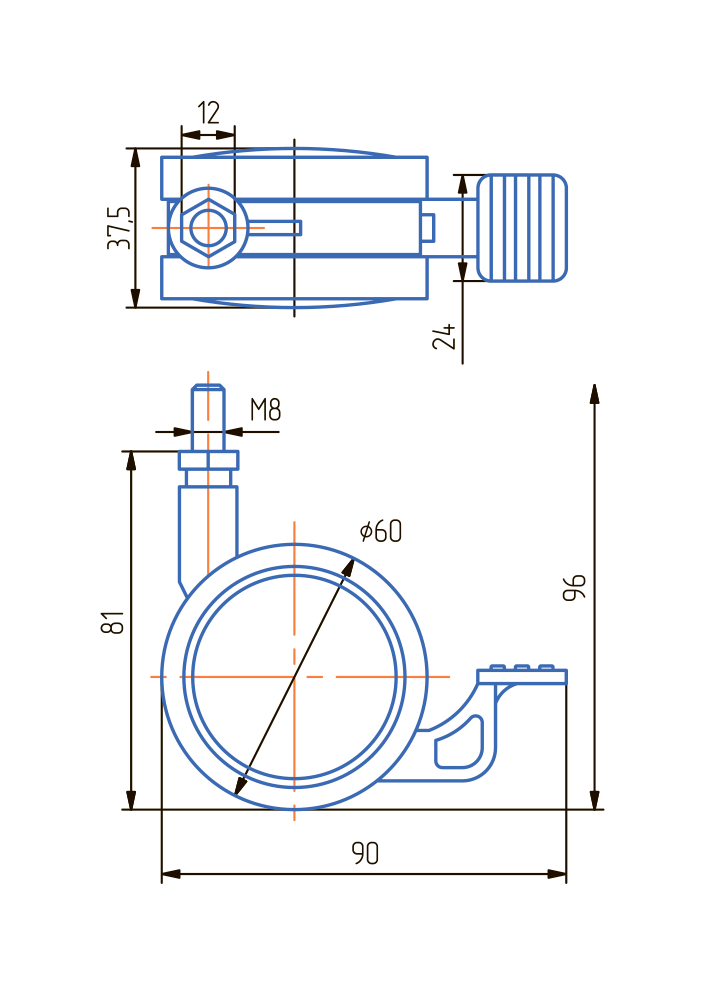 Опора колесная ОК60мм со штыр М8, с тор м/х(ОКП61М.Х/Т)