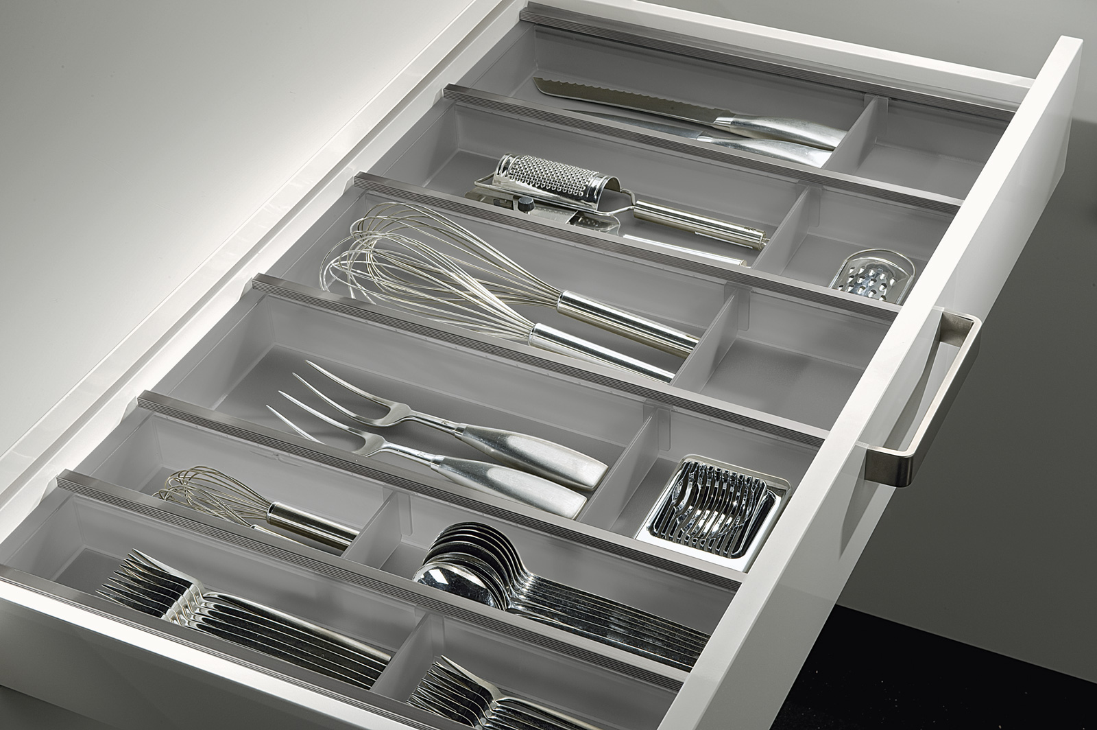 Элегантная и высококачественная система вставок для ящиков, выполненная из полупрозрачных пластиковых лотков и алюминиевых соединительных профилей. Благодаря сложному зажимному соединению они гибко приспосабливаются к разной ширине ящика. Каждый лоток может быть укомплектован регулируемыми перегородками.
