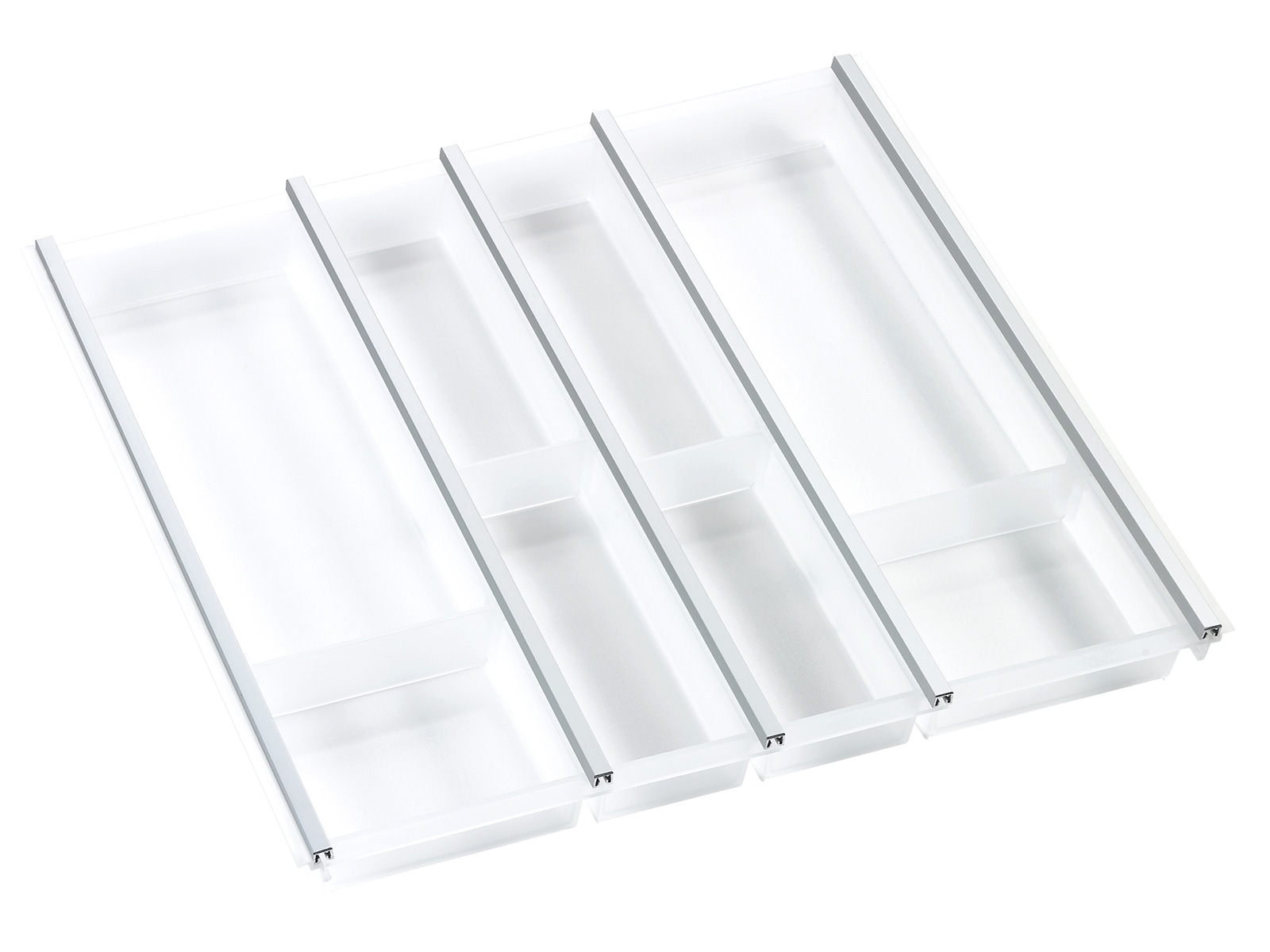 Элегантная и высококачественная система вставок для ящиков, выполненная из полупрозрачных пластиковых лотков и алюминиевых соединительных профилей. Благодаря сложному зажимному соединению они гибко приспосабливаются к разной ширине ящика. Каждый лоток может быть укомплектован регулируемыми перегородками.