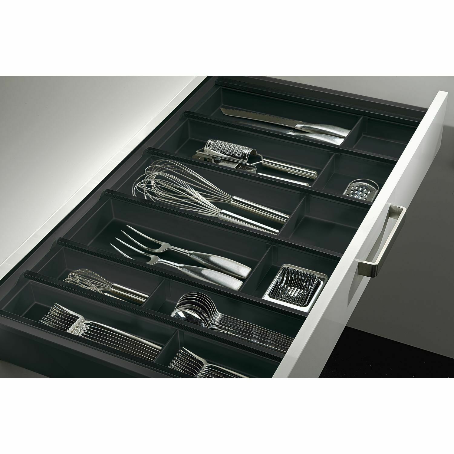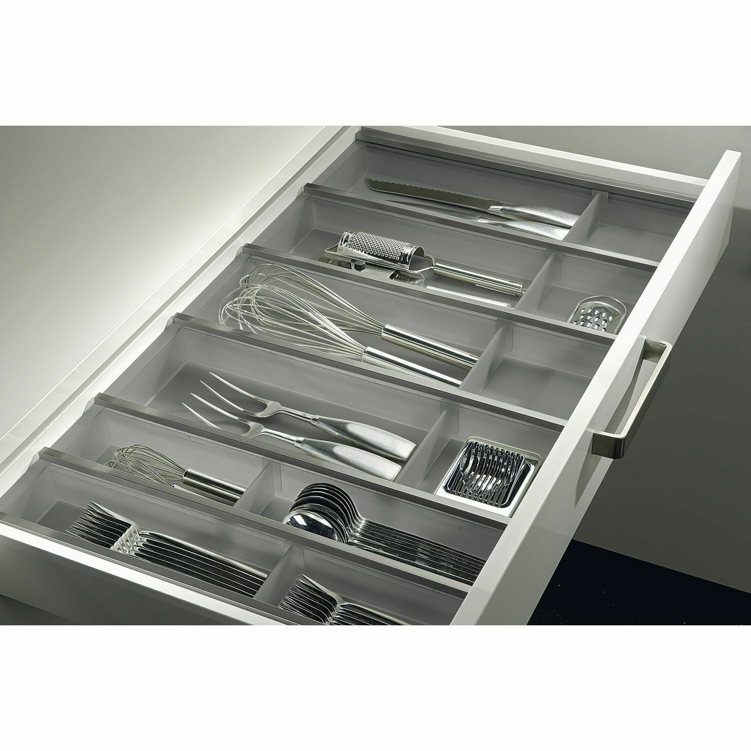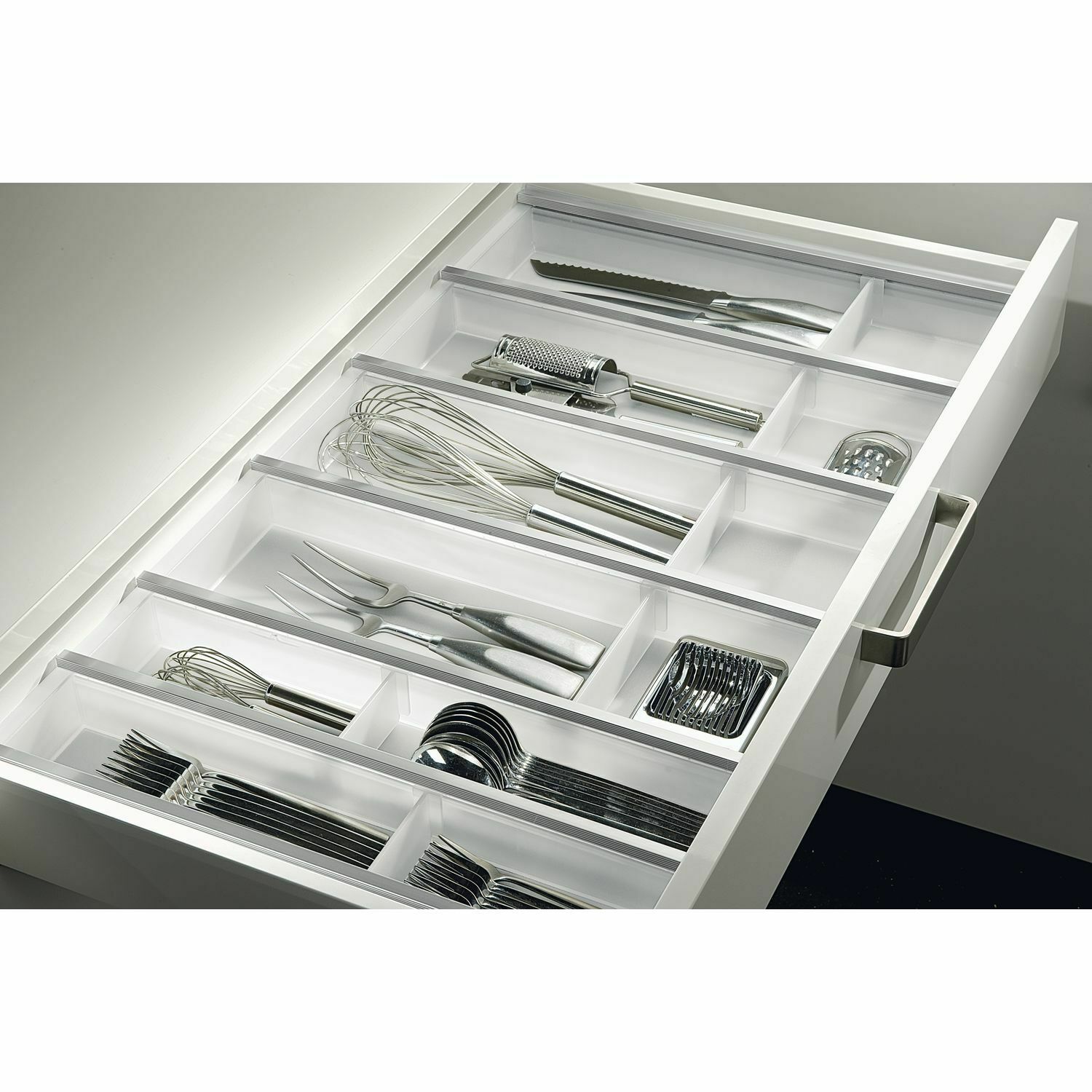 Элегантная и высококачественная система вставок для ящиков, выполненная из полупрозрачных пластиковых лотков и алюминиевых соединительных профилей. Благодаря сложному зажимному соединению они гибко приспосабливаются к разной ширине ящика. Каждый лоток может быть укомплектован регулируемыми перегородками.