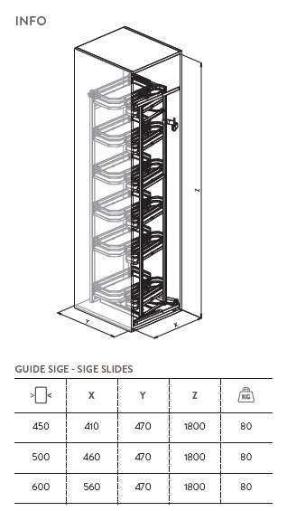 Колонна выдвижная, направляющие полного выдвижения SIGE, доводчик, 12 корзин, дно из меламина, корзина из плоской проволоки, шкаф 600мм