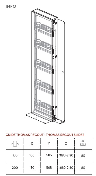 Колонна выдвижная, направляющие полного выдвижения Thomas Regout, доводчик, нагрузка 80 кг, 5 корзин, дно из меламина, корзина из круглой проволоки, шкаф 150мм