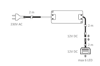 Блок питания LED STANDARD PLUS 12W 12VDC, черный провод 6 м, разветвитель 6 гнезд арт.U12-012-SP-2C0-4W6
