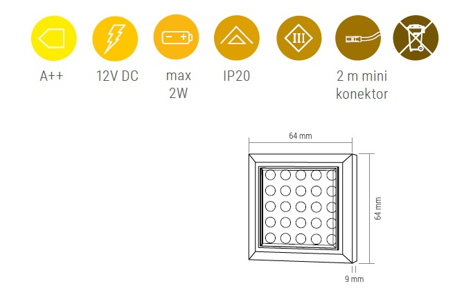 Светильник LED SQUARE XL, 2,0W 12VDC 25LED 3000К, провод 2 м, алюминий арт.SQUARE-XL-AL-30K-01
