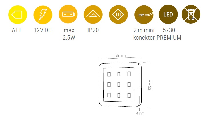 Светильник LED SQUARE 3, 2,5W 12VDC 9LED 6000К, провод 2 м, черный арт.SQUARE3-CZ-60K-01W