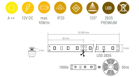 LED лента PREMIUM 60LED/1м 50 м 2835 IP20 8 мм 4000К 10W/1m арт.R-2835-50-20-40K-02
