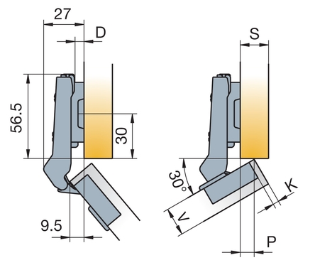 Петля Titus B-Type угловая 30° представляет собой четырехшарнирный механизм, специально разработанный для установки на угловые корпуса мебели с углом раскрытия 30 градусов. Модель обеспечивает угол открывания фасада 110° и имеет подъем (cranking) 9 мм, что соответствует параметрам для угловых петель данного типа. Межцентровое расстояние составляет 45 мм.