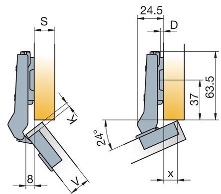 Петля S-type 24 градуса 110/52/9 мм относится к типу угловых и открывается на 24 градуса. Выпускается под брендом Titus, чьи производственные мощности расположены на территории Словении. Изготавливается из качественных материала, сверху имеет покрытие из никеля, служащее антикоррозионной защитой. Может использоваться для любых деревянных фасадов кухонной, офисной, корпусной, детской и прочих типов мебели. Монтируется на типовую планку Clip-on. Чашка петли устанавливается без винтов или саморезов. Относится к среднему ценовому сегменту.