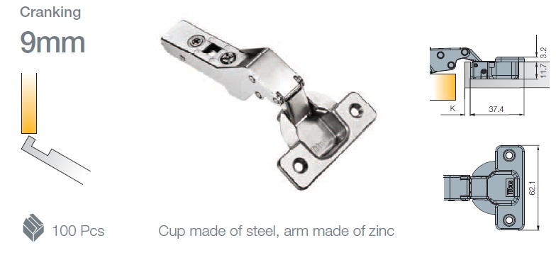 Петля изготовлена из высококачественной стали с защитным никелевым покрытием, устойчивым к коррозии и механическим повреждениям. Диаметр стандартной чашки петли составляет 35 мм с глубиной сверления 12 мм, что делает ее совместимой с фасадами из ДСП, МДФ и массива .