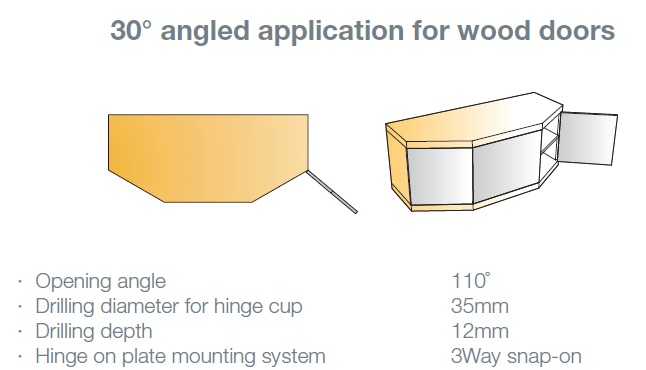Данная петля предназначена для установки на угловые корпуса мебели с углом 30° и ориентирована на использование с деревянными фасадами. Она идеально подходит для: