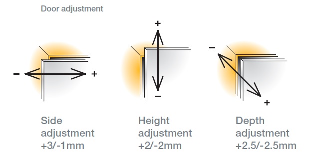 - Регулировка: После навешивания произведите точную юстировку фасада с помощью отвертки. Регулировочные элементы позволяют выставить зазоры по горизонтали (+3/-1 мм), вертикали (+2/-2 мм) и глубине (+4/-1 мм) для достижения идеального прилегания и плавного хода .