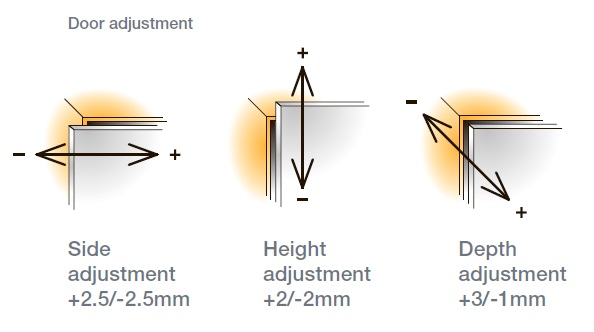 - Трехмерная регулировка: Возможность точной подгонки фасада по горизонтали, вертикали и глубине позволяет идеально выровнять створки даже при незначительных погрешностях изготовления корпуса.