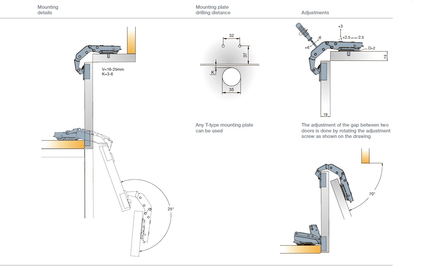 Петля изготовлена из высококачественной стали с защитным никелевым покрытием, устойчивым к коррозии и механическим повреждениям. Диаметр стандартной чашки петли составляет 35 мм с глубиной сверления 12 мм, что делает ее совместимой с фасадами из ДСП, МДФ и массива толщиной 15-26 мм . Петли T-type рассчитаны на 25 лет надежной и стабильной работы на всех типах фасадов .