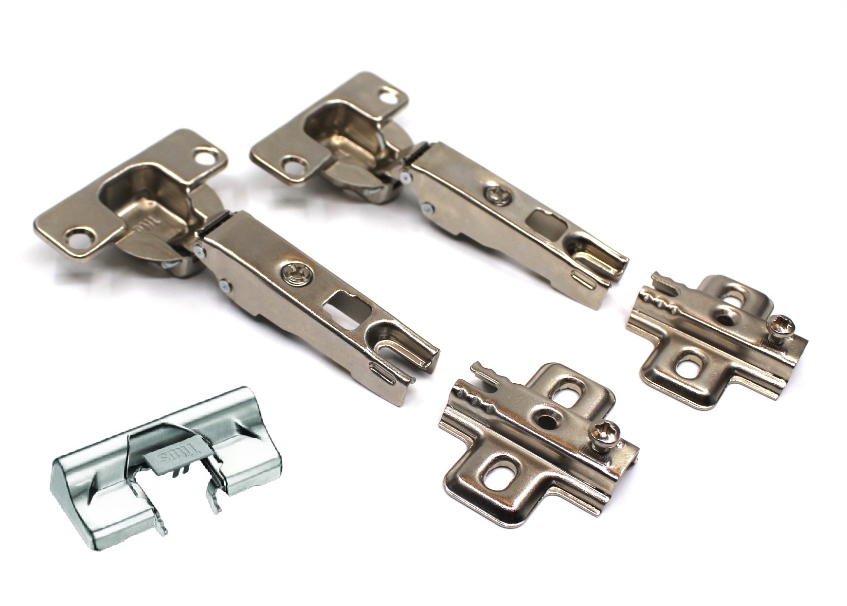 - Петли мебельные Titus B-Type (2 шт): Это накладные четырехшарнирные петли для прямых корпусов (угол 90°), обеспечивающие угол открывания фасада 110°. Параметры петель (межцентровое расстояние и подъем) соответствуют стандартным решениям для накладных фасадов . Петли изготовлены из высококачественных материалов (замак и сталь) с защитным никелевым покрытием, устойчивым к коррозии . Ключевая особенность — система монтажа Slide-on, позволяющая устанавливать фасад на ответную планку скользящим движением .