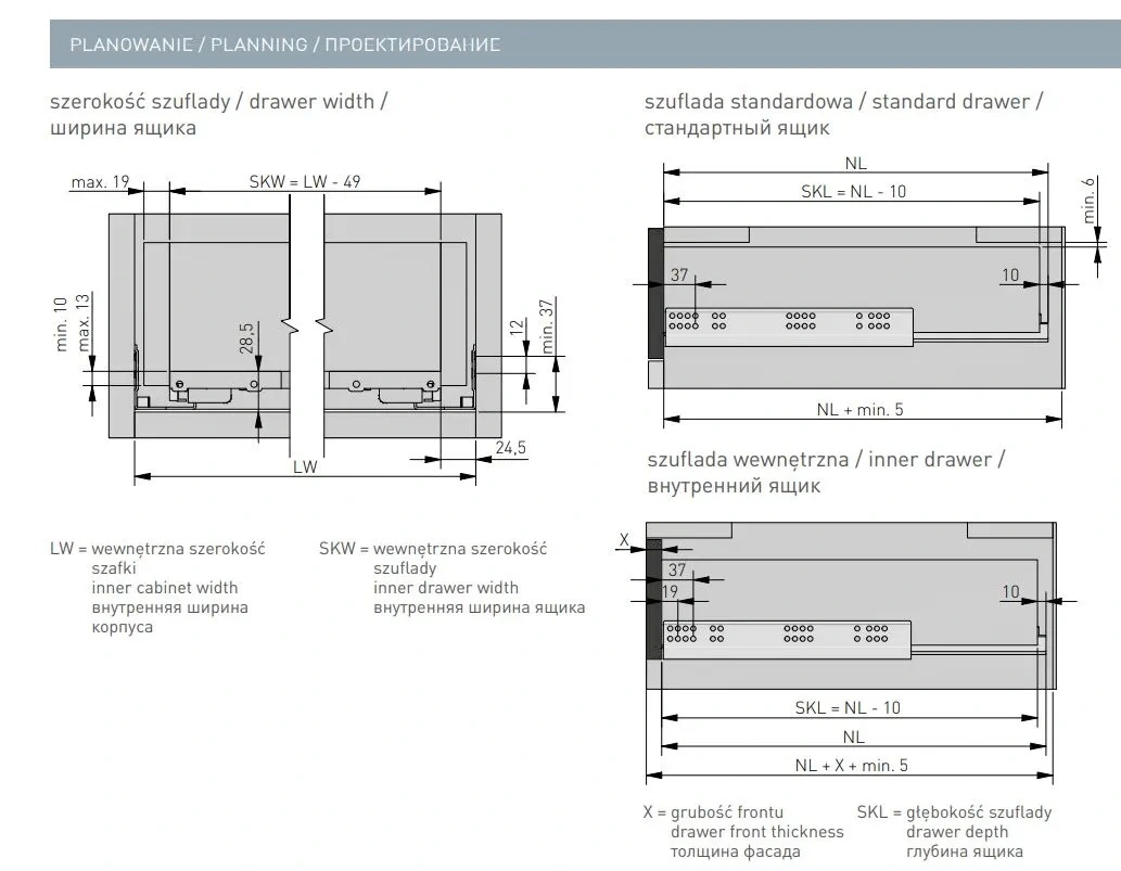 Направляющие MODERN SLIDE L-500 с 3D регулировкой полного выдвижения для деревянных ящиков с доводчиком - механизмы, используемые в различных мебельных конструкциях с выдвижными ящиками. Характерная особенность направляющих Модерн Слайд - скрытый монтаж, когда их установка осуществляется не на боковины ящика, а под его дно.