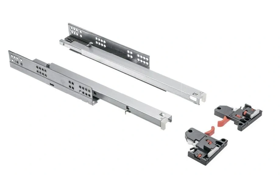 Направляющие MODERN SLIDE L-550 с 3D регулировкой полного выдвижения для деревянных ящиков с доводчиком - механизмы, используемые в различных мебельных конструкциях с выдвижными ящиками. Характерная особенность направляющих Модерн Слайд - скрытый монтаж, когда их установка осуществляется не на боковины ящика, а под его дно.