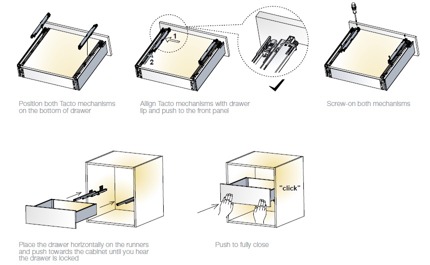 Tekform Slimline Tacto - система открывания Push Open Tacto для фасадов ящиков без ручек.