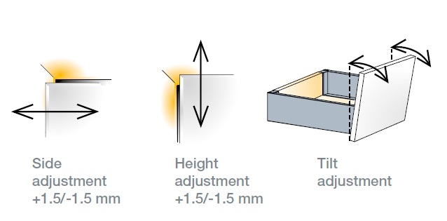 Ящик Tekform Slimline+ оснащен трехмерным механизмом регулировки, расположенным в передней части ящика, который обеспечивает точный контроль над регулировкой высоты, стороны и наклона.