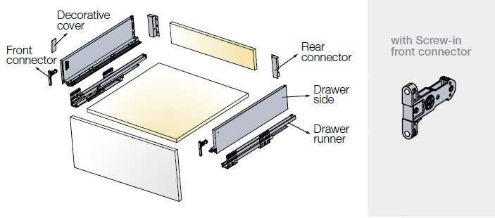 Tekform Slimline Tacto имеет активатор, встроенный в направляющую ящика, в то время как все остальные компоненты остаются такими же, как и для «стандартной» версии Slimline, а также положения сверления и фиксации.